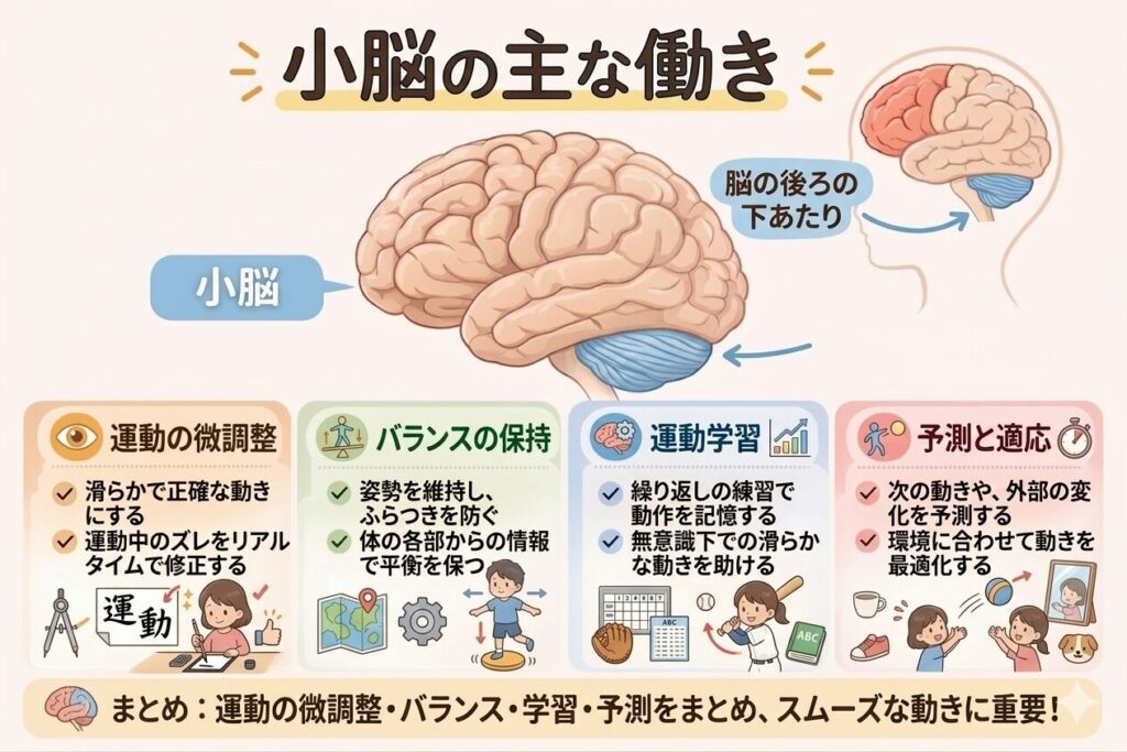 その中で 小脳(しょうのう) は、体の動きをスムーズにする役割を持っています。