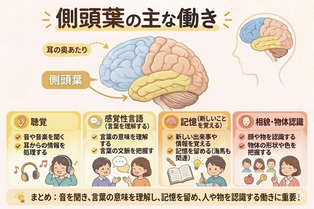 側頭葉は脳の横側(耳の上あたり)にある部分で、次のような働きを担っています。